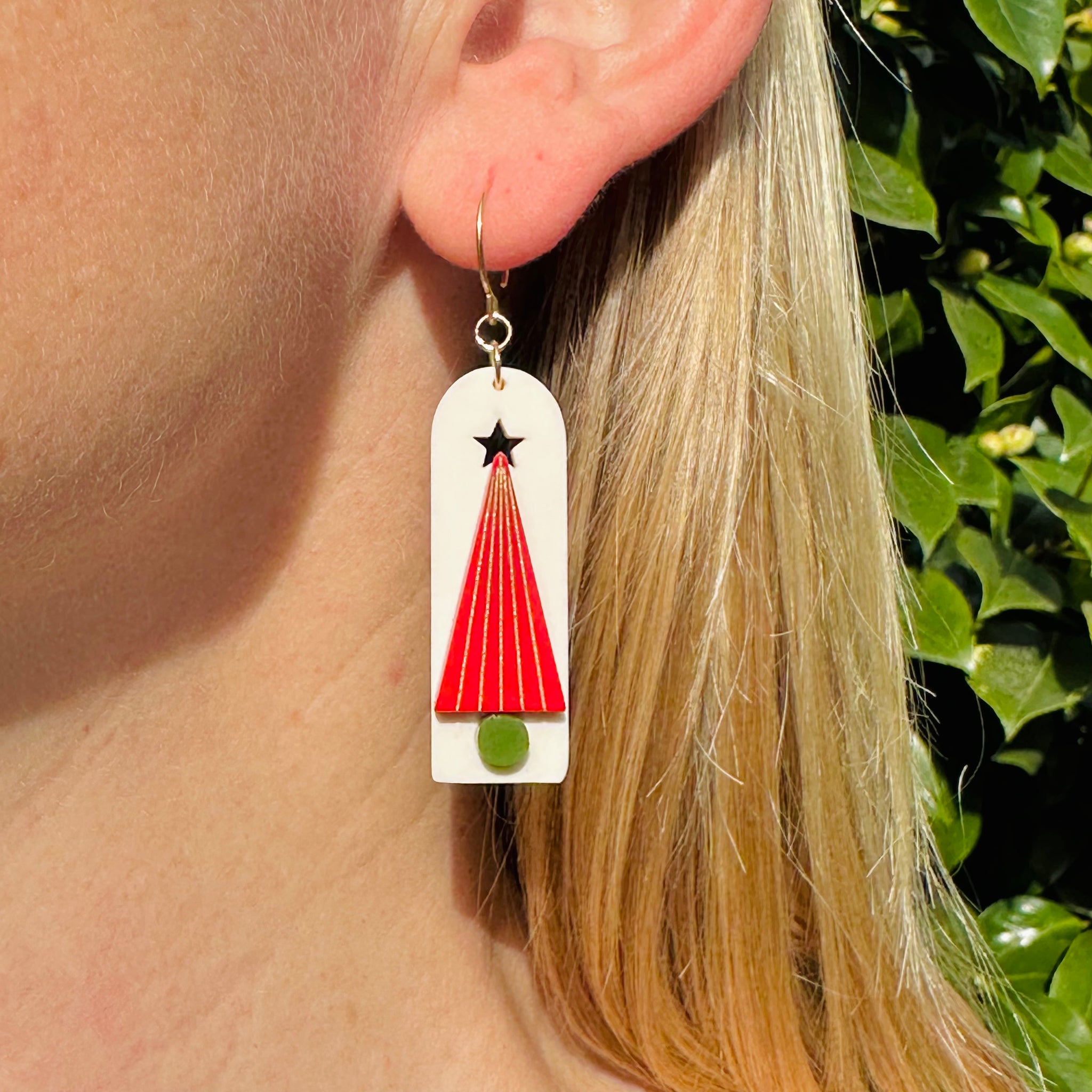 Sophisticated + festive without being over the top – our Christmas tree earrings are perfect for mid-century modern design lovers! An ode to yesteryear – these darling holiday tree earrings whisk us back to fond memories of festive gatherings with family + friends sipping hot cocoa + glögg + stuffing our bellies with rice pudding + pepparkakor spice cookies. Available in three styles + limited edition colorways.
