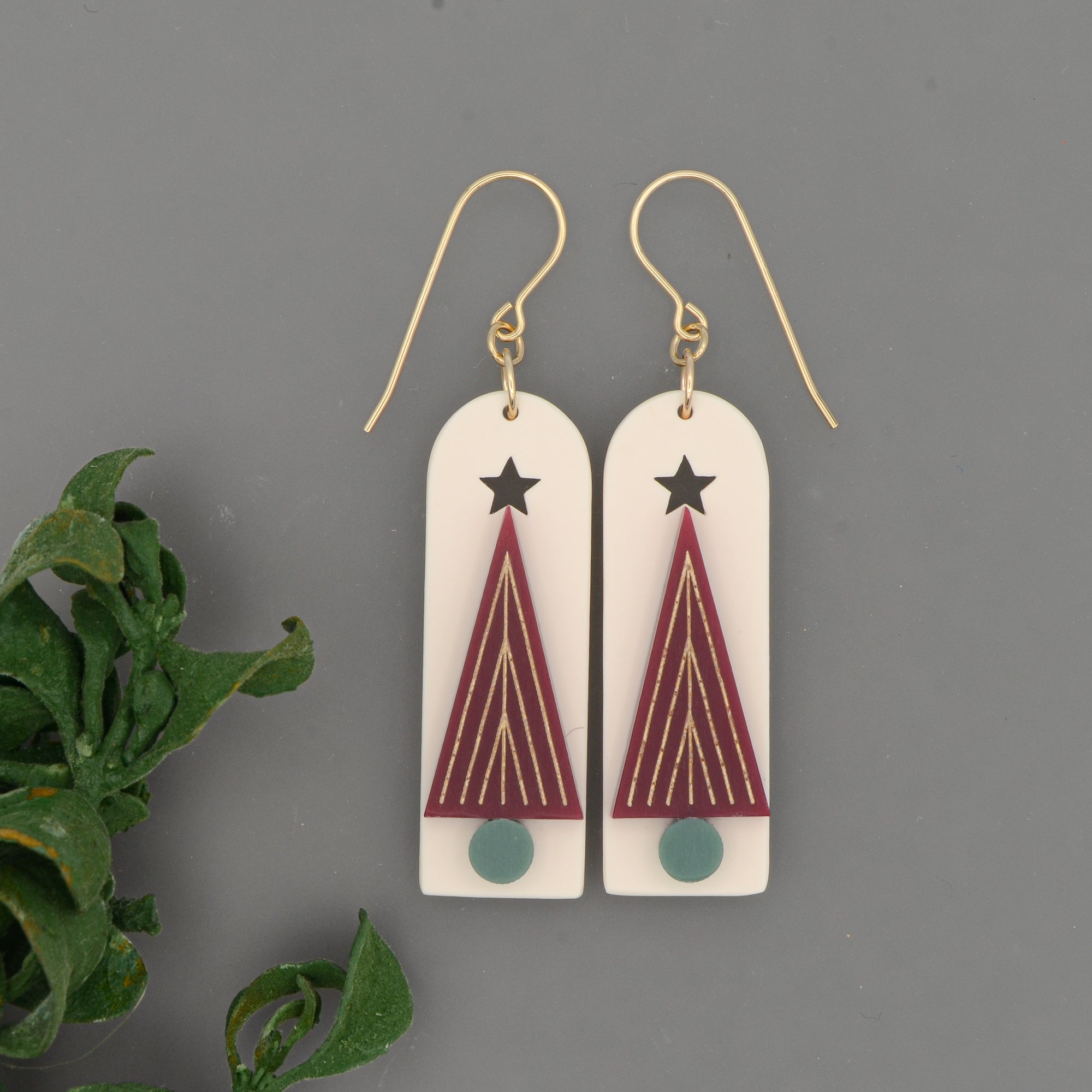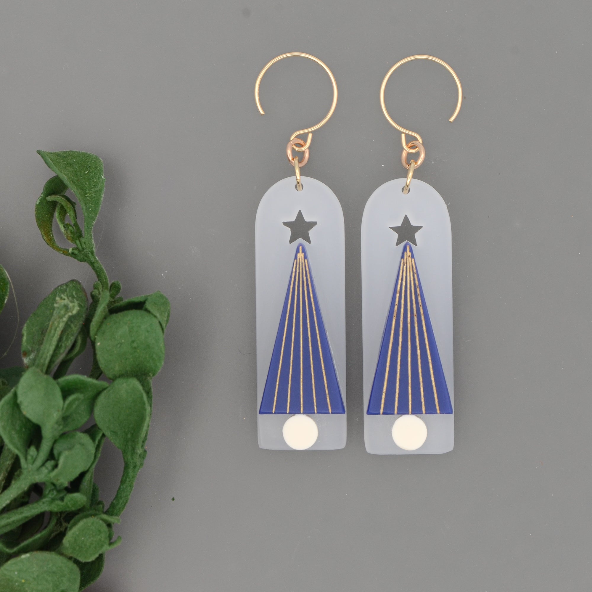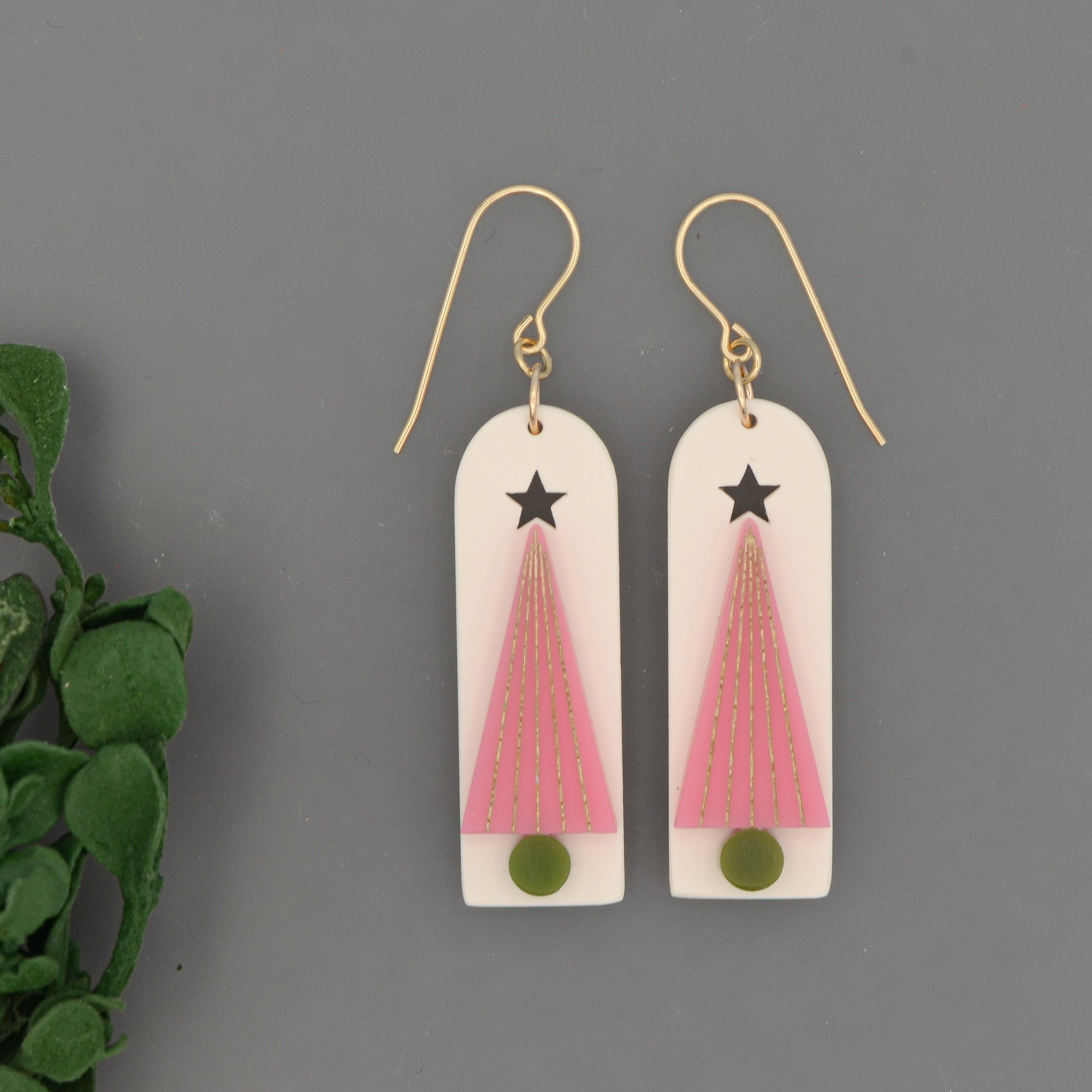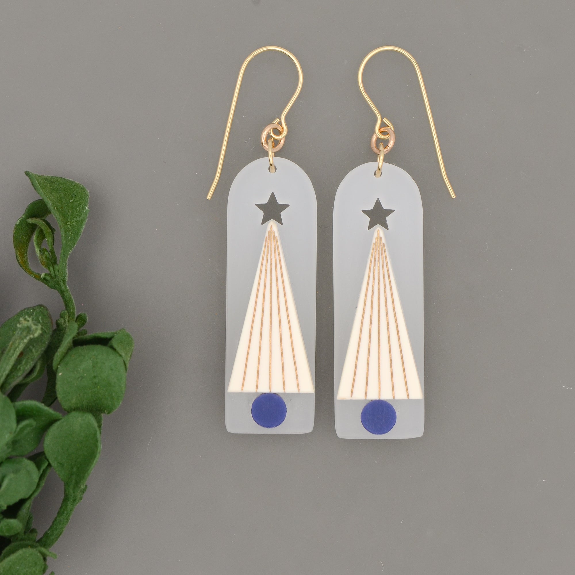 Each MCM tree earring is made of acrylic geometric shapes precisely hand-pieced to a solid arched backplate with a peekaboo star cut out. Delicate hand-painted metallic lines shimmer throughout the triangular tree shape.