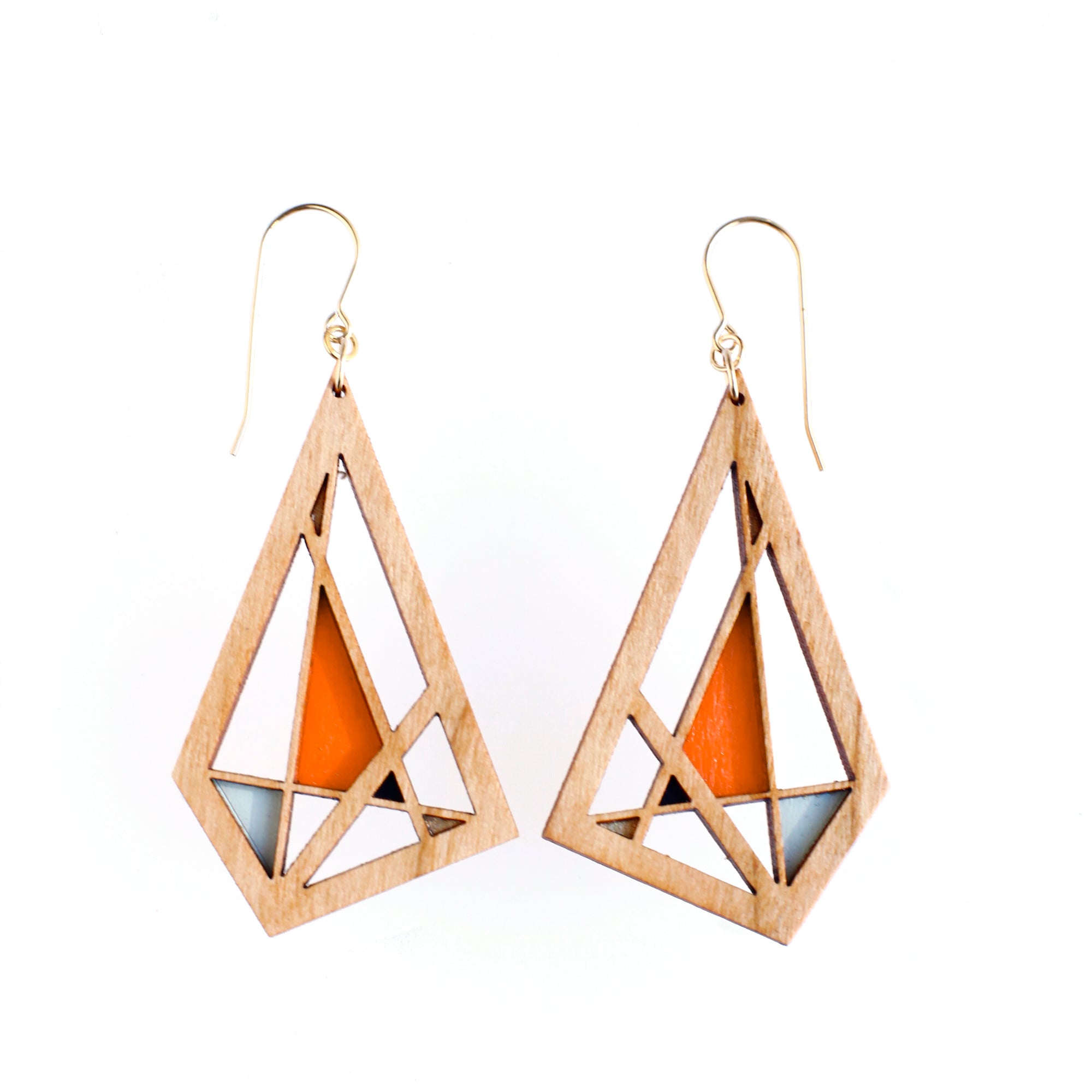 · finished on your choice of 14K gold-fill or oxidized sterling silver hardware · intricately laser engraved + hand-painted in our California studio · measure 2" long x 1.25" wide · made of USA-grown cherry + walnut woods · made of two layers of thin wood planks that make them strong, while remaining light as a feather · varnished to protect though not intended to wear in water · due to the natural qualities + varying grain of wood, each piece is unique!